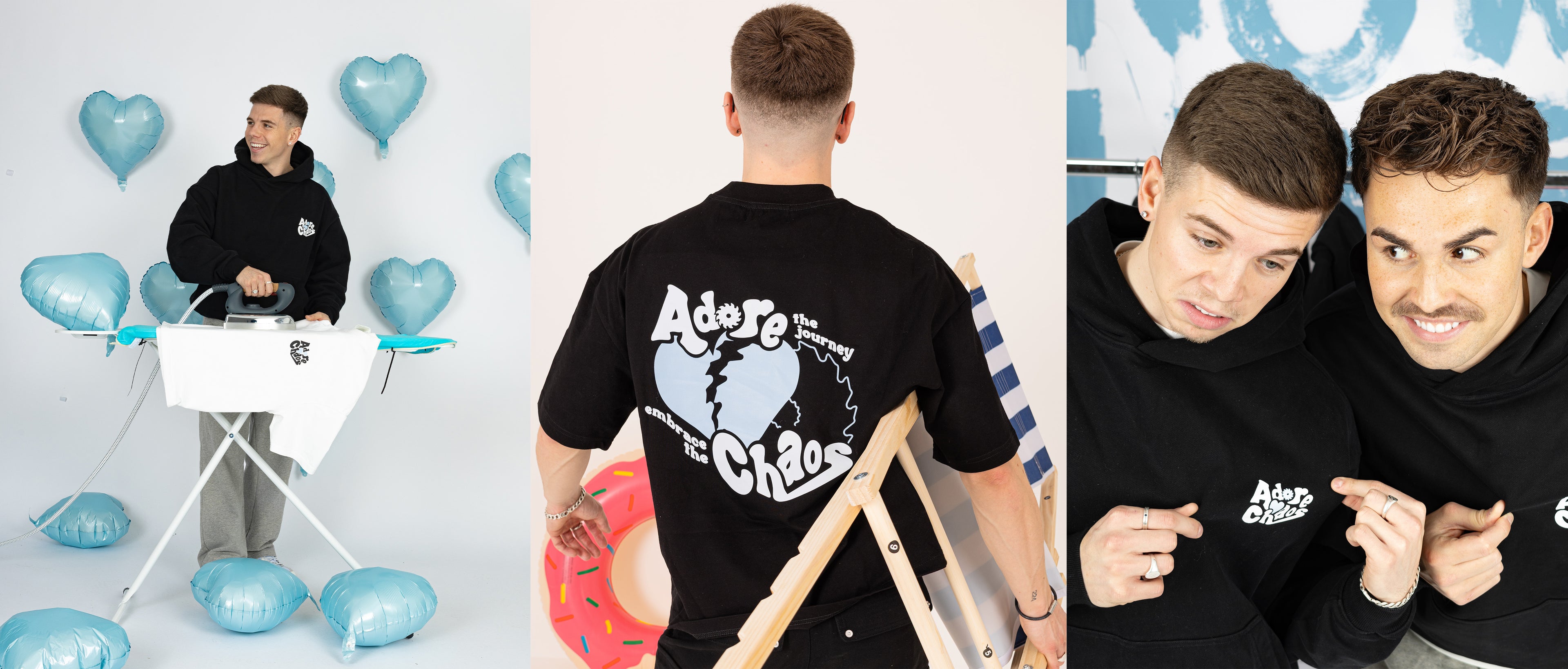 The idea for Adore Chaos started with me, George. I wanted to create a brand that didn’t shy away from life’s chaos but leaned into it instead. So, I teamed up with Ben and Alfie. They’ve spent almost a decade running Destructive, designing timeless wardrobe staples that pretty much redefine what quality looks like. Together, we’ve shaped Adore Chaos into something bold, authentic, and built to handle whatever life throws your way.